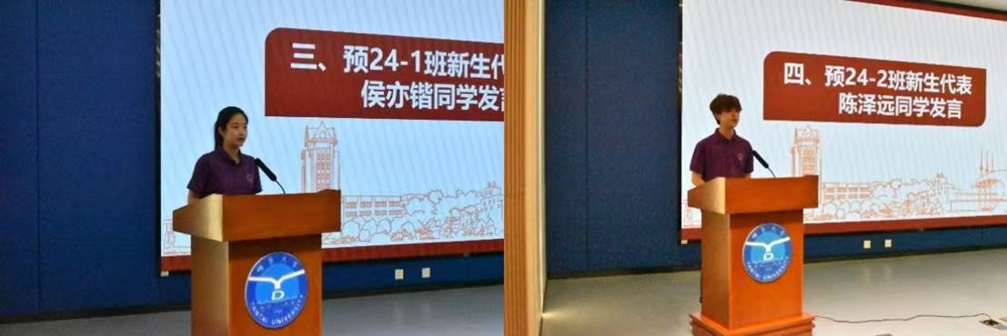 预24-1班新生代表侯亦锴分享了做为军训标兵的获得感,倡议同学们尽快适应大学新生活,明确学习奋斗目标,并全身心投入到学习中去。预24-2班新生代表陈泽远表示将不辜负公司和公司的期望,与大家一起积极面对困难和挑战,敢于突破自我,勇于追梦逐梦。