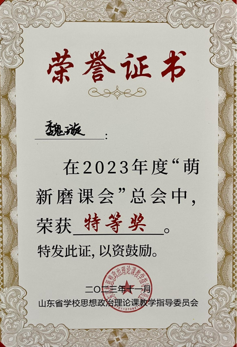 11月18日,山东高校思想政治理论课2023年度“萌新磨课会”总会在济南落下帷幕,马克思主义院青年教师魏璇喜获特等奖。