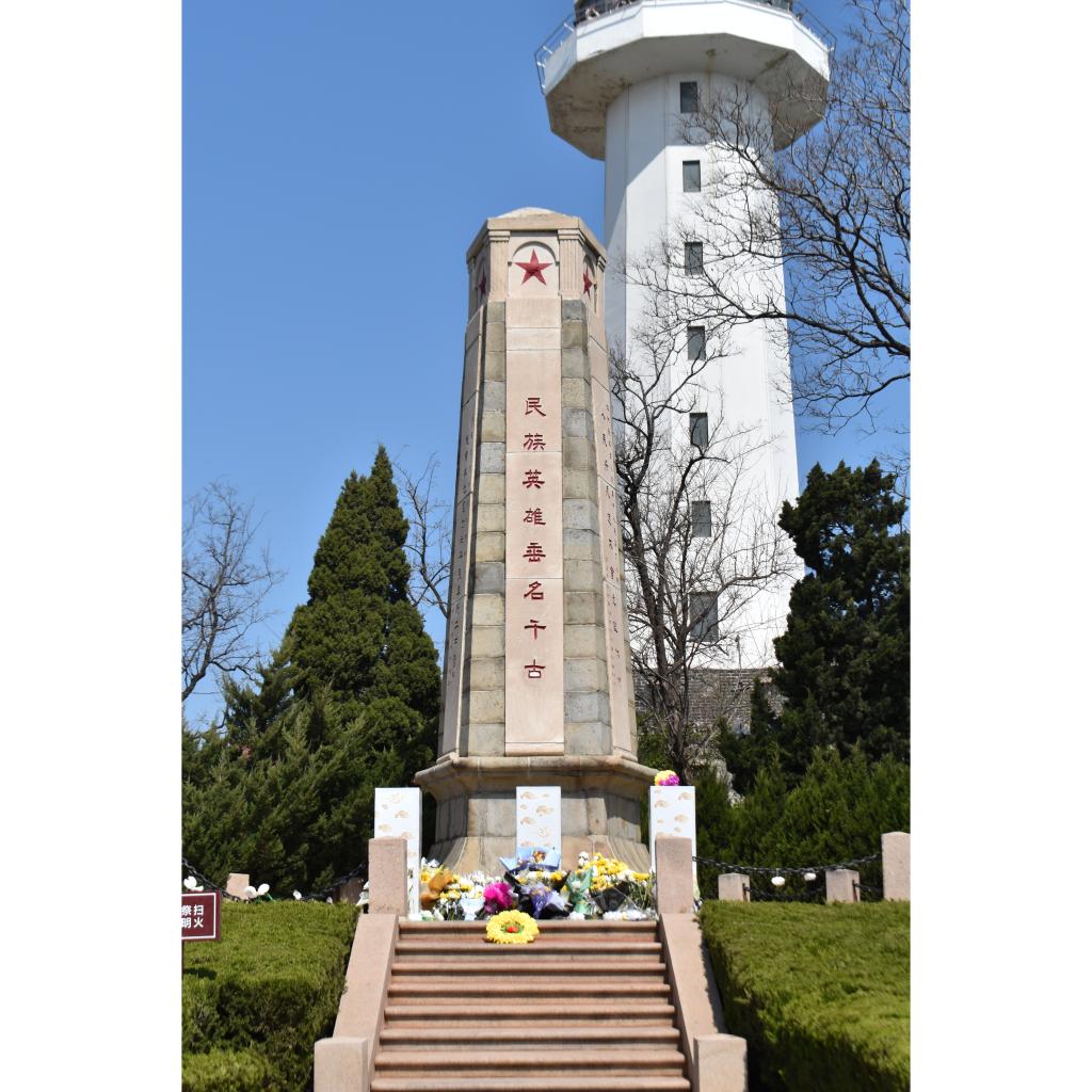 烟台山抗日烈士纪念塔及历史文物遗址主要包括烟台开埠陈列馆、胶东革命史陈列馆、冰心纪念馆、抗日烈士纪念碑。在主持人孟乐瑶的带领下,同学们来到了烟台抗日烈士纪念碑前,高高耸立的纪念碑庄严肃穆的矗立在那里,像先烈们百年前保卫家乡一样,今天依然坚定地守卫着的烟台。主持人简要介绍了烟台山抗日烈士纪念碑的背后的英雄事迹,同学们全体肃立,共唱国歌,集体默哀一分钟,以表达哀思和怀念在集体默哀的一分钟里,我们仿佛能看见、能听到、能真实感受到革命时期那波澜壮阔艰苦卓绝、可歌可泣的壮丽篇章