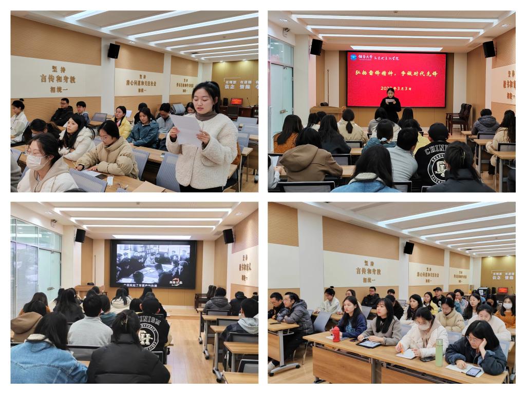 本次活动主要以座谈会的形式开展。在座谈会上,主持人郝伟简要介绍雷锋的生平事迹,组织同学们观看毛主席为雷锋同志的亲笔题词,重温雷锋语录,学习雷锋精神的深刻内涵,理解新时代弘扬雷锋精神的重要意义。雷锋同志是时代的榜样,人民的榜样,同学们一起观看影片《学习雷锋精神薪火相传》深入了解雷锋同志的光辉事迹。影片结束后,同学们对雷锋精神有了更深刻的理解,纷纷表示要学习和弘扬雷锋不怕吃苦、无私奉献的伟大精神。胡婷婷、张雪莹、夏宇辉、李淑伟等同学相继分享了自己对雷锋精神的感悟。其中,胡婷婷同学从雷锋同志的英雄事迹出发,分享了对雷锋精神具体内容的深刻理解,雷锋同志具有崇高理想和坚定信念,他服务人民、助人为乐,锐意进取、自强不息,艰苦奋斗、勤俭节约,是我们新时代员工的榜样。张雪莹同学讲到:“雷锋,他不仅仅是一个名字,更是一种精神,一座丰碑,感召一辈辈人不计小我,成就大我;激励了一代代人多行善举,不做恶行。他在雨中来,于晴中去,很久以后他的痕迹会慢慢淡去,但精神不会终止。”新时代的我们理应学习雷锋的这种精神,真学、真懂、真信、真用马克思主义,筑牢信仰之基、补足精神之钙,淬炼思想、涵养正气、升华境界、指导实践,急他人之所急、想他人之所想,争做奉献社会的模范。