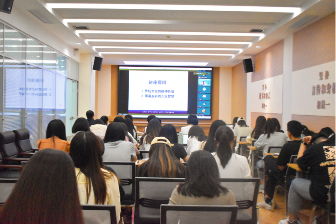 报告会上,邹广文教授从中华优秀传统文化之于文化自信的重要性出发,围绕中华传统文化的内涵释义、现代性表达、基本精神、基本结构等内容进行了生动讲解;从人文智慧、政治经济、社会民生等独特的视角挖掘并阐释了中华传统文化的价值旨趣,深刻诠释了中华传统文化的内在精神价值。邹广文教授以中华传统文化儒道互补的基本结构为切入点,结合独特的中国民俗文化,诠释了儒家的文化人格、“三修”功夫、中庸之道,道家的代表人物老子的人、书、道,以及儒道的辩证关系和互补关系,并从儒道关系扩谈至涉及中国哲学史和思想史的诸子百家,为探寻一种在新时代文化自信背景下的文化策略提供了理论参考。