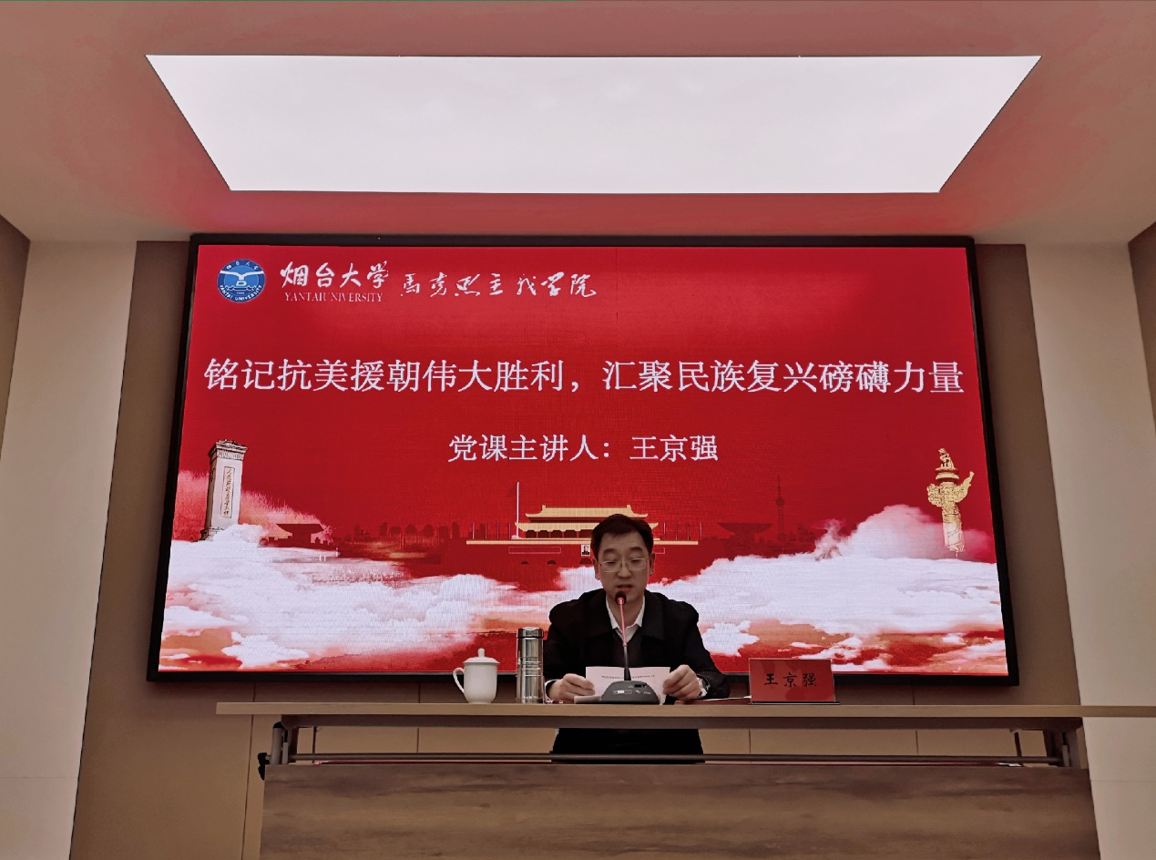 王京强从抗美援朝战争爆发的国际背景、回望抗美援朝战争辉煌史以及抗美援朝战争的深远历史意义和深刻国际影响三方面,以丰富的史料、详实的数据和历史内在逻辑,深刻解读了党中央和毛泽东同志当年作出中国人民志愿军出国作战重大决策的艰难历程,全面讲述了抗美援朝战争的艰苦历程,从大历史角度,深入分析了抗美援朝战争的历史重要地位、深远历史意义、现实意义和国际影响。本次党课内容丰富,视野广阔,具有高度政治性和现实针对性,是一次抗美援朝战争史、党史、新中国史和国际关系史教育,是一场革命英雄主义、理想信念和党性教育。广大青年学生深为毛泽东同志为核心的老一辈革命家对复杂事物的卓越洞察力、判断力和非凡的胆略、魄力所折服,深为志愿军将士谱写了惊天地、泣鬼神的雄壮史诗,锻造的伟大抗美援朝精神,所感动、所激励。