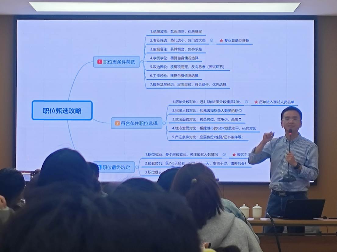申鹏宇老师聚焦“政策性岗位科学选岗”,从专业类别、岗位情况、难度分析、选岗技巧四个方面展开讲解。他紧密结合公司的专业,通过分析各地历年招录数据,讲解报录比差异及风险规避技巧,为同学们指出了报考时的注意事项。